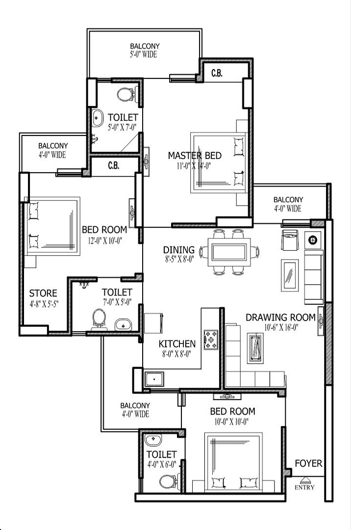 2 Bedrooms + Study Room + Drawing + Dining + Kitchen + 2 Toilets + Store + Balconies + Foyer