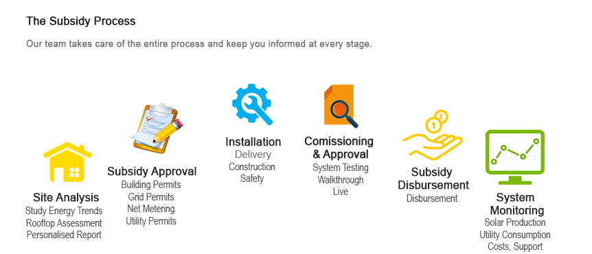 The Solar Power Plant Subsidy Scheme is very consumer friendly. The entire process of approval is managed and organized by us. You just need to register before the subsidy quota gets over and we take care of the rest. Call our executive to understand the registration process, then just sit back and relax. Our team takes care of the entire process and keeps you informed at every stage. Here is the process made simple for you!!